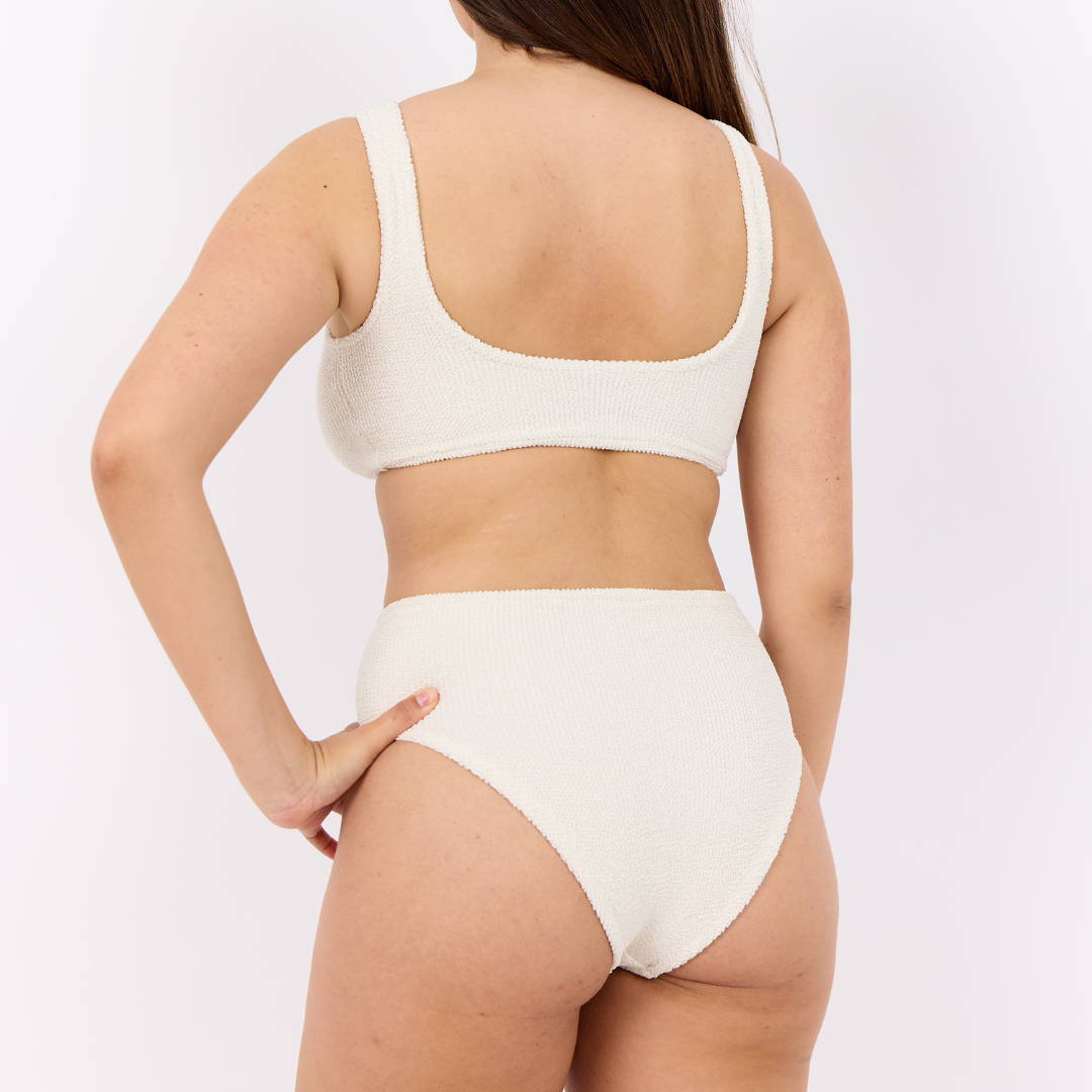 Vores One Size badetøj er lavet med omhu og begynder sin rejse som materiale vævet ind i et rør, før det bliver syet til badetøj. Denne metode gør slutproduktet alsidigt nok til at passe til størrelserne 32-42. Den er designet specielt til at tilpasse sig problemfrit til alle kroppe. Uanset om det er et spørgsmål om størrelse, pasform eller de skiftende former hos gravide og efter fødslen, takket være dets bemærkelsesværdigt fleksible materiale.